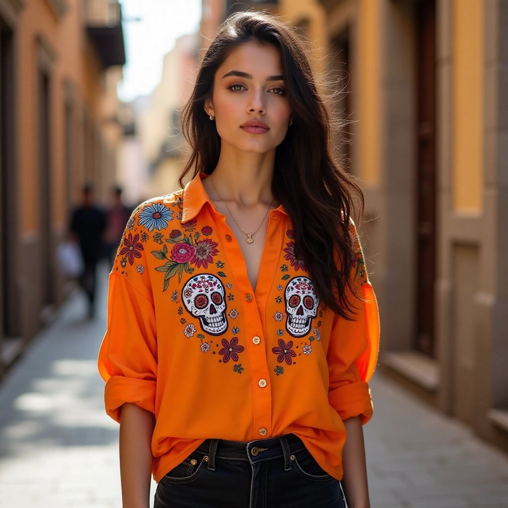 Classy Mexican Day Of The Dead Inspired Pattern Art Printed Linen Long Sleeve Shirt