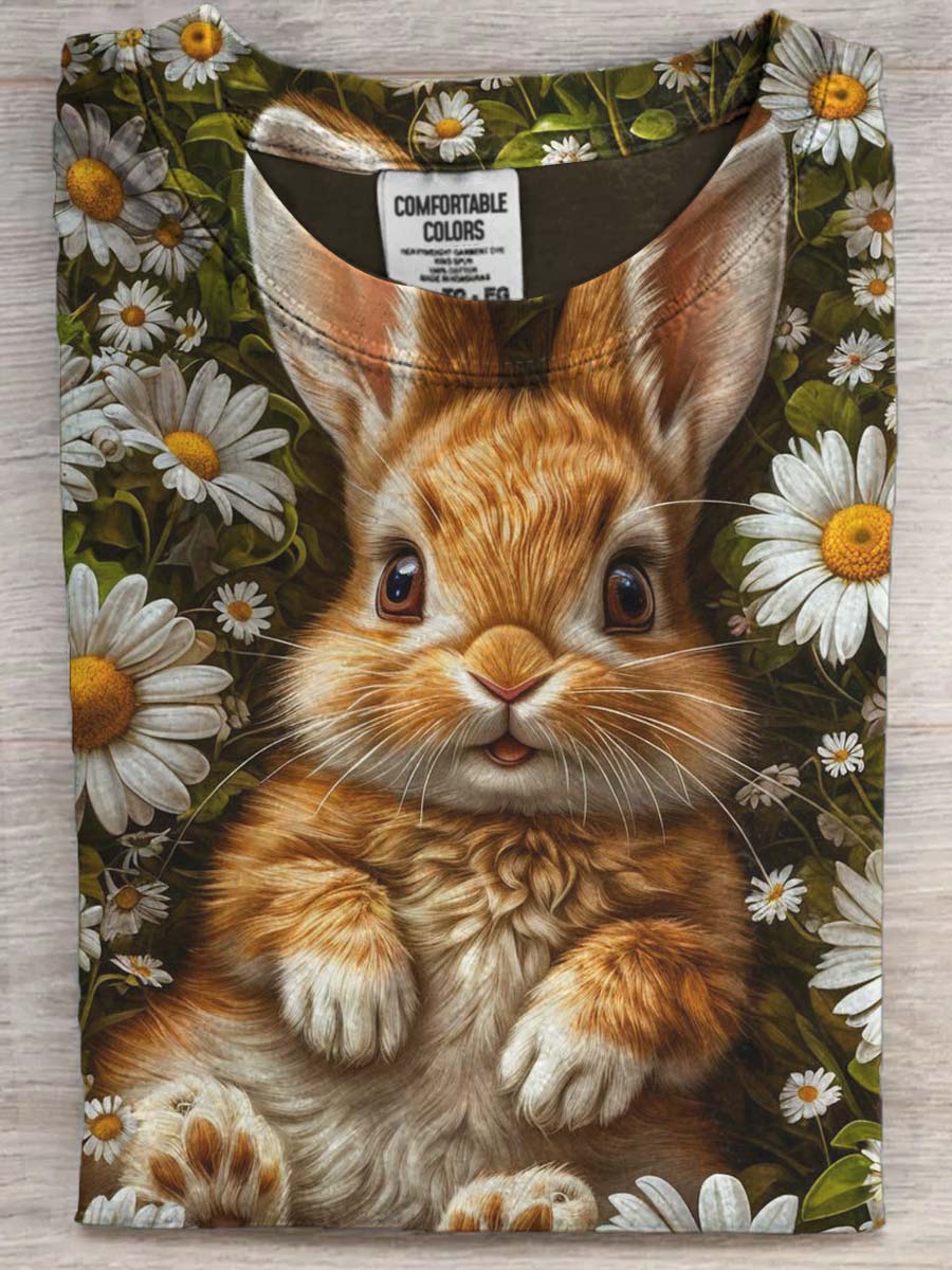 Cute Floral Bunny Print Casual Short Sleeve T-Shirt