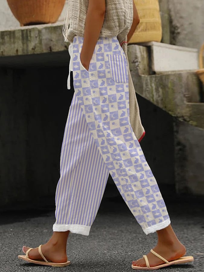 Easter Bunny Moon Checkerboard Stripes Lace-Up With Pocket Trousers