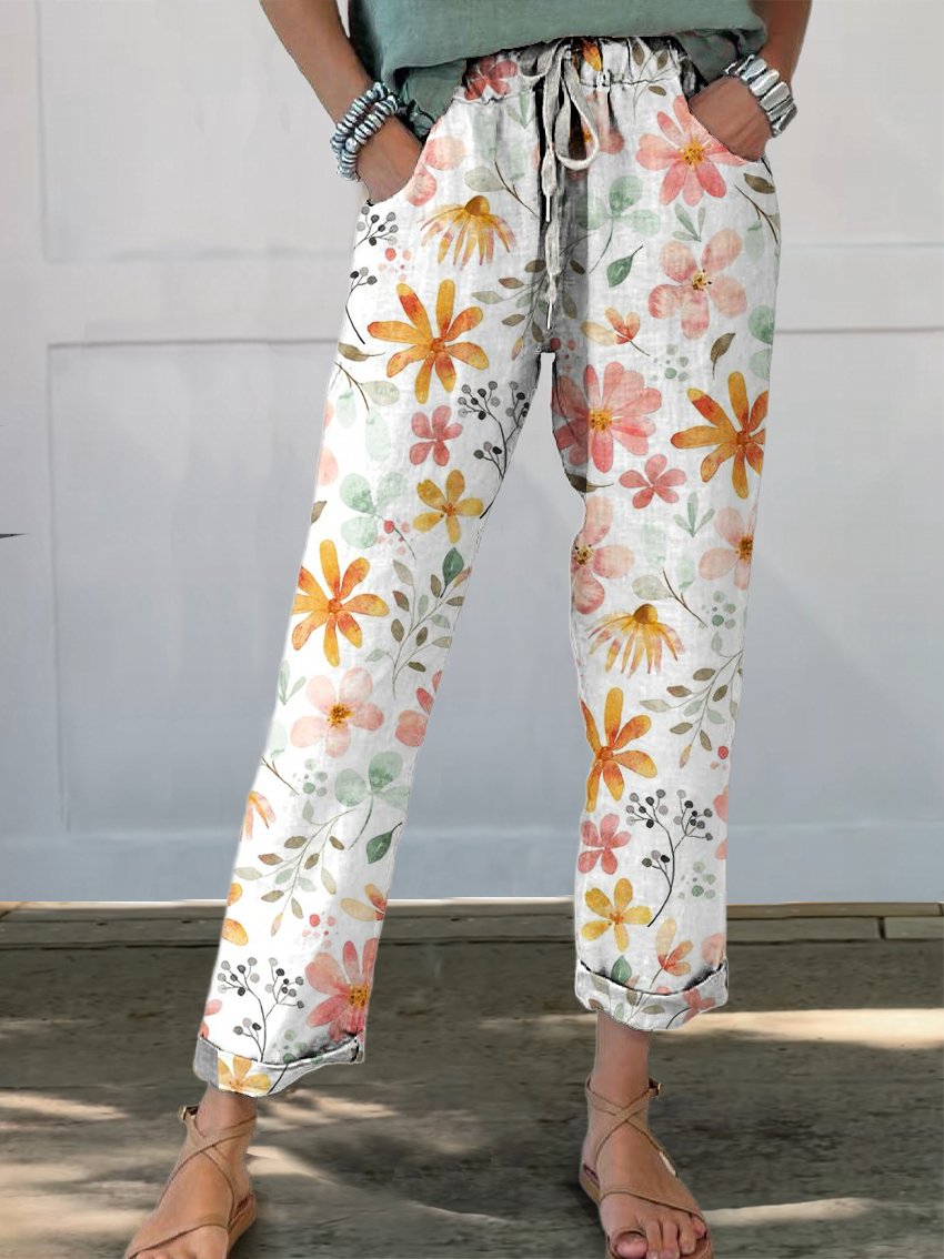 Fresh Floret Print Women's Printed Cotton And Linen Casual Pants