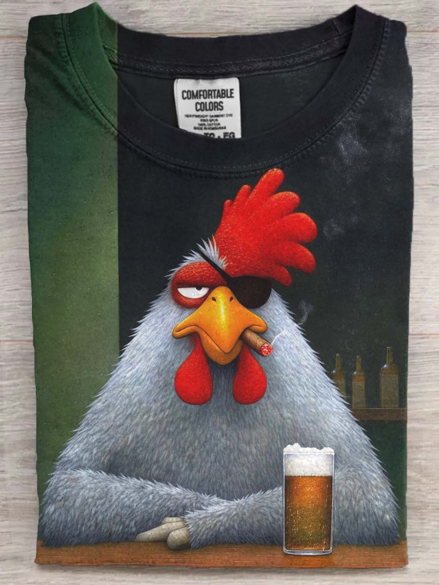 Fun Rooster Smoking & Drinking Printed Casual Short Sleeve T-Shirt