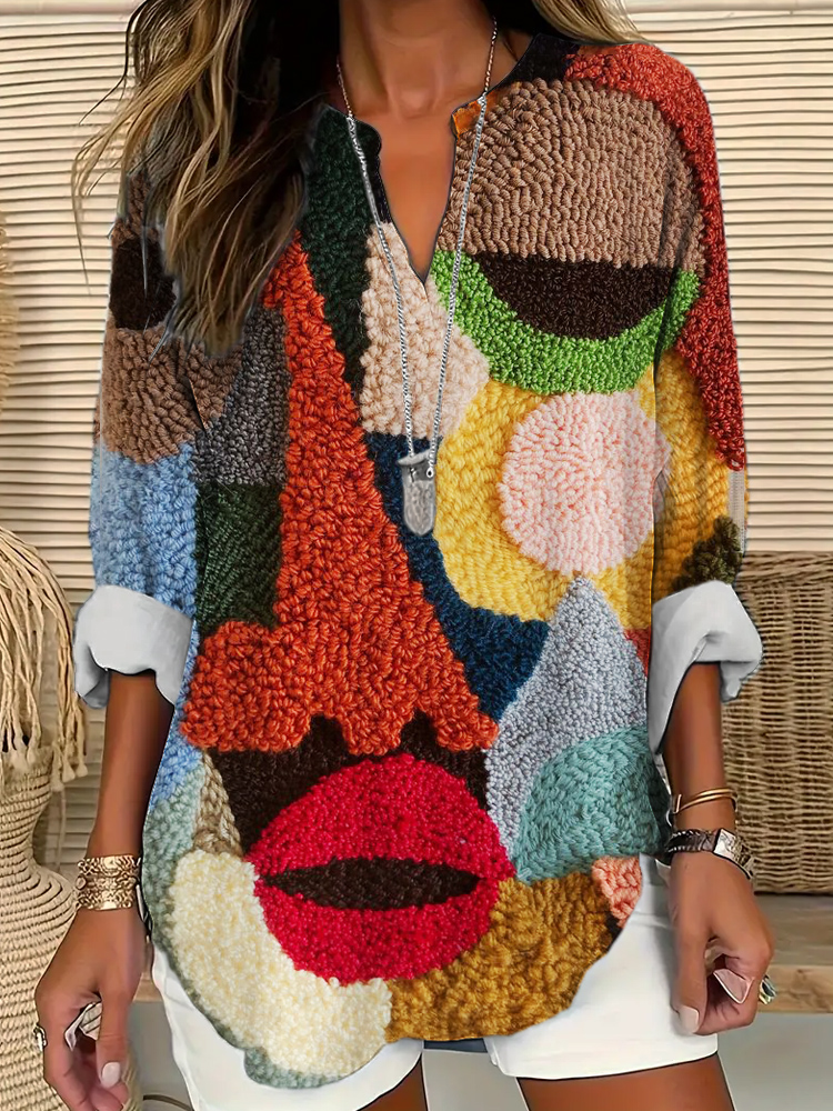 Face Geometric Abstract Art Women's Linen V-neck Long Sleeve Shirt