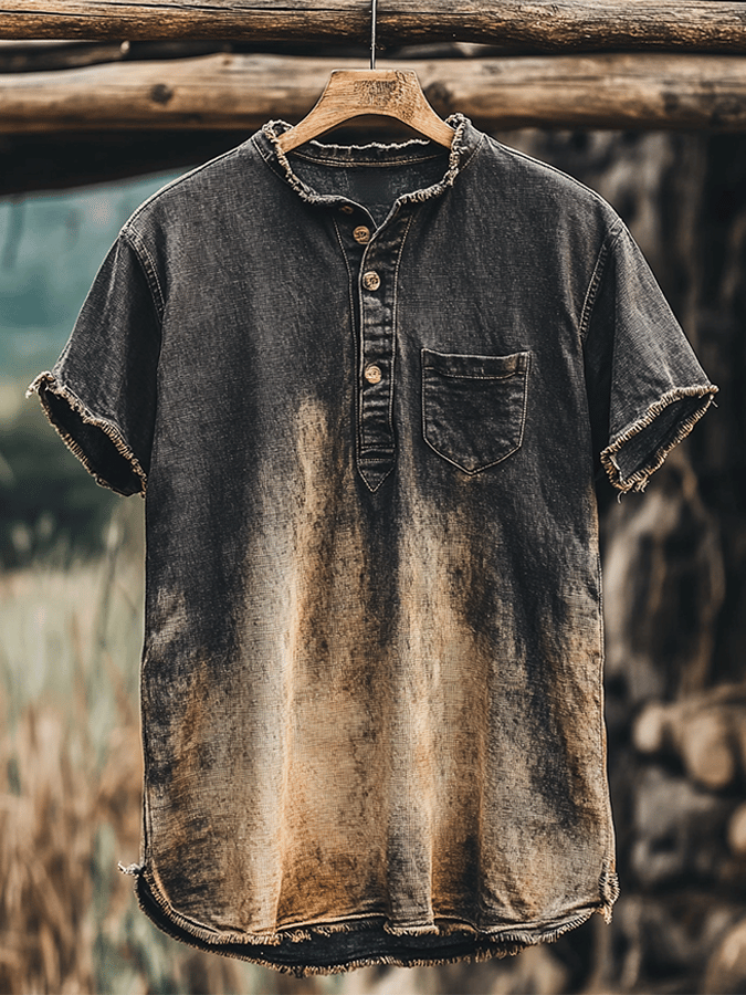 Men's Basic Fashion Retro Casual Washed Distressed Raw Edge Henry Collar T-shirt