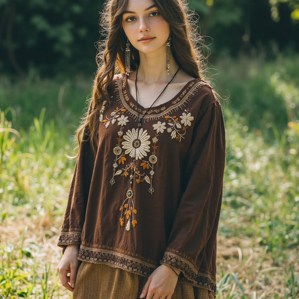 Retro Floral Embroidery Linen Blend Long Sleeve T-shirt