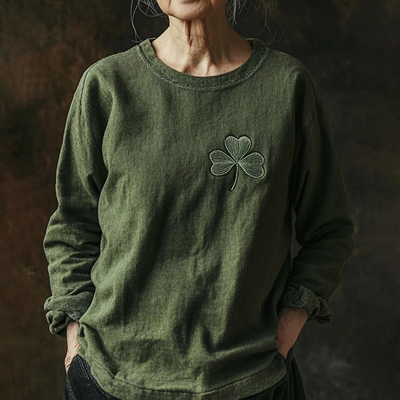 St. Patrick's Shamrock Embroidered Crew Neck Loose Linen Blend T-shirt