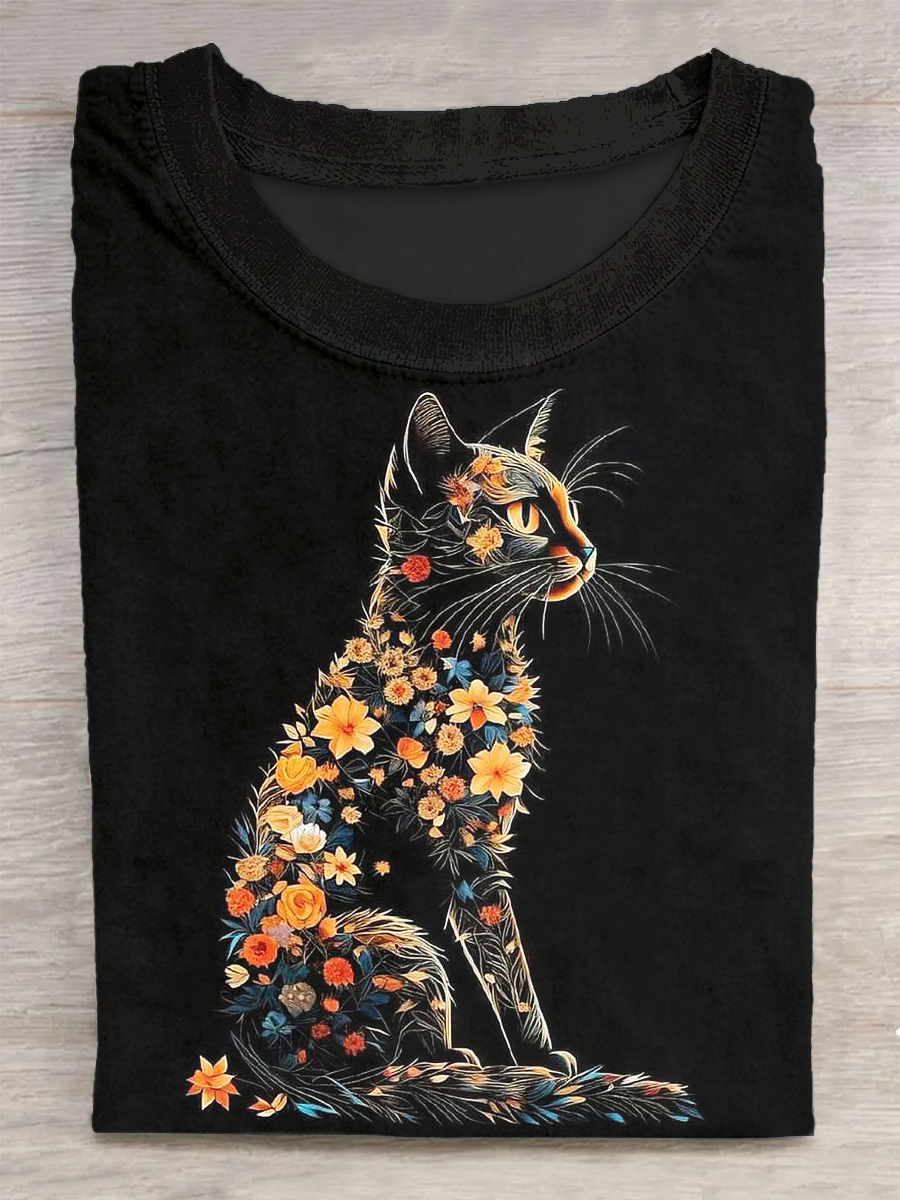 Unisex Flower Cat Printed Vintage Fashion Loose Short Sleeve T-Shirt