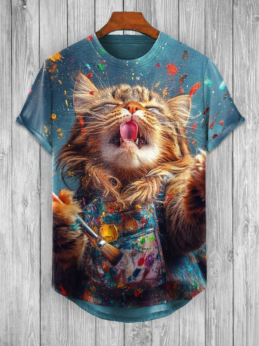 Unisex Retro Cat Printed Fashionable Loose Short Sleeved T-shirt With Irregular Hem