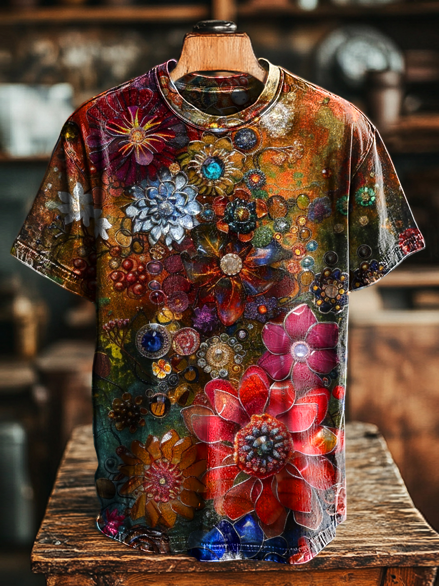 Unisex Retro Multicolor Floral Print Casual Loose Short Sleeve T-Shirt