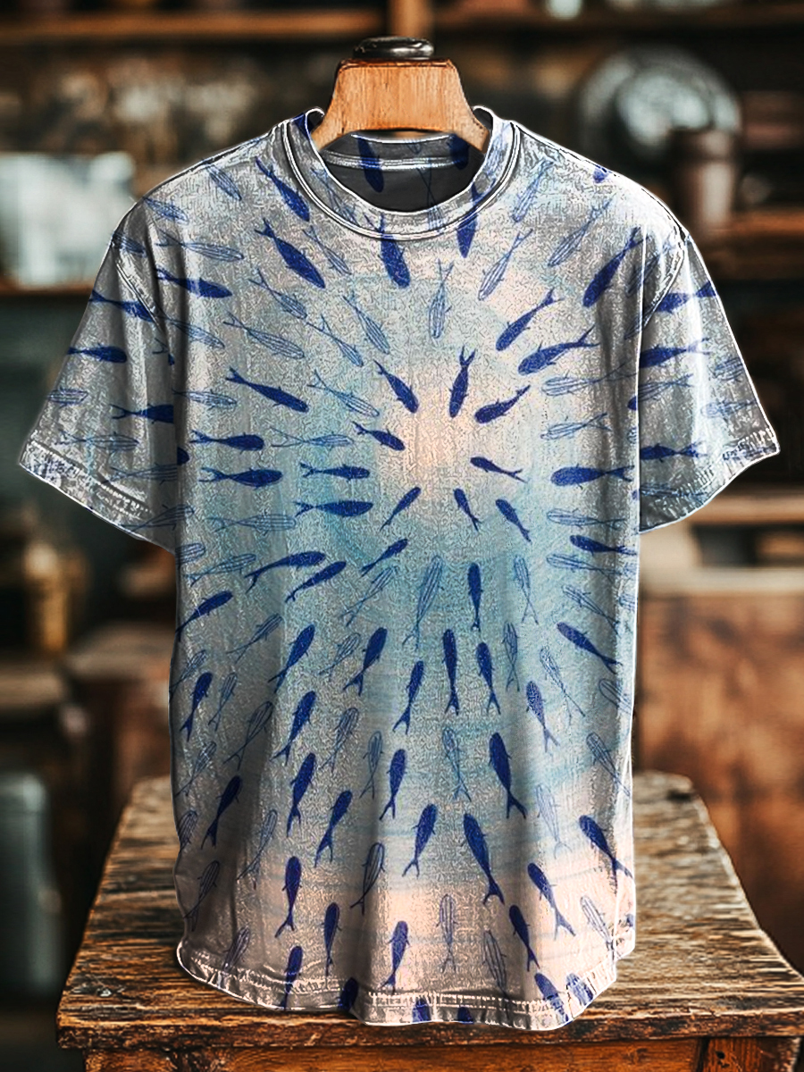 Unisex Vintage Swirl Fish Art Print Casual Loose T-Shirt