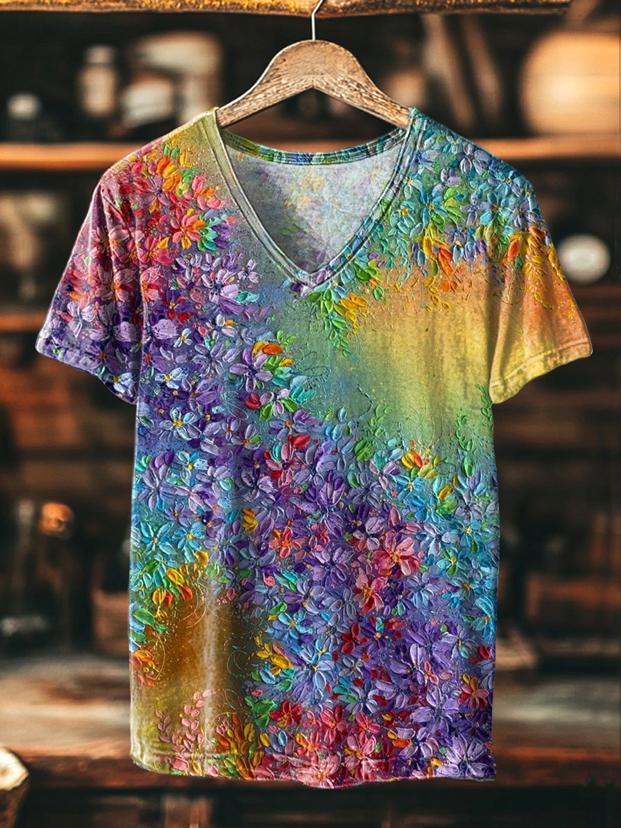 Vintage Colorful Floral Swoosh Oil Print Casual V-Neck T-Shirt
