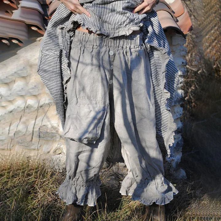 Vintage Elastic Waist Button Cotton Linen Casual Pants