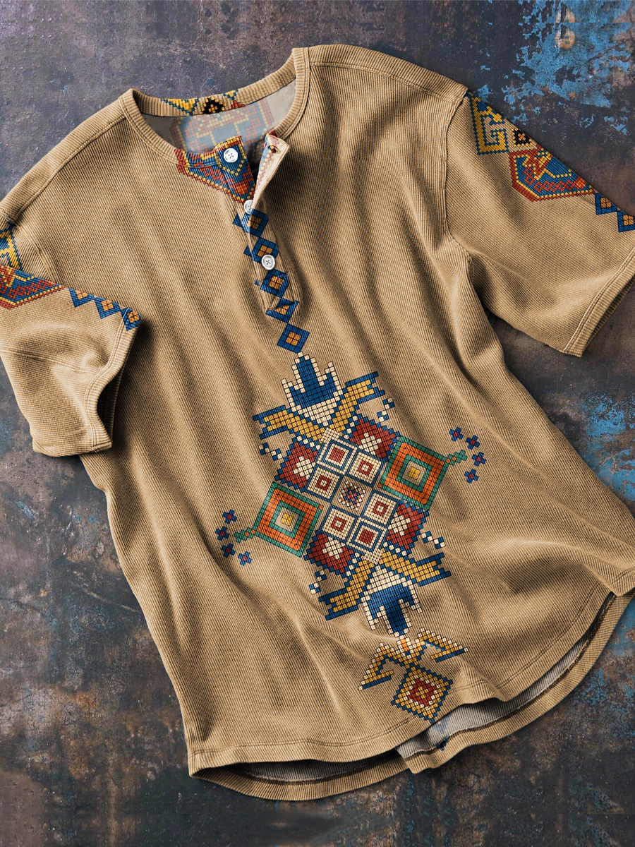 Vintage Ethnic Geometric Art Print Casual 3 Button T-Shirt