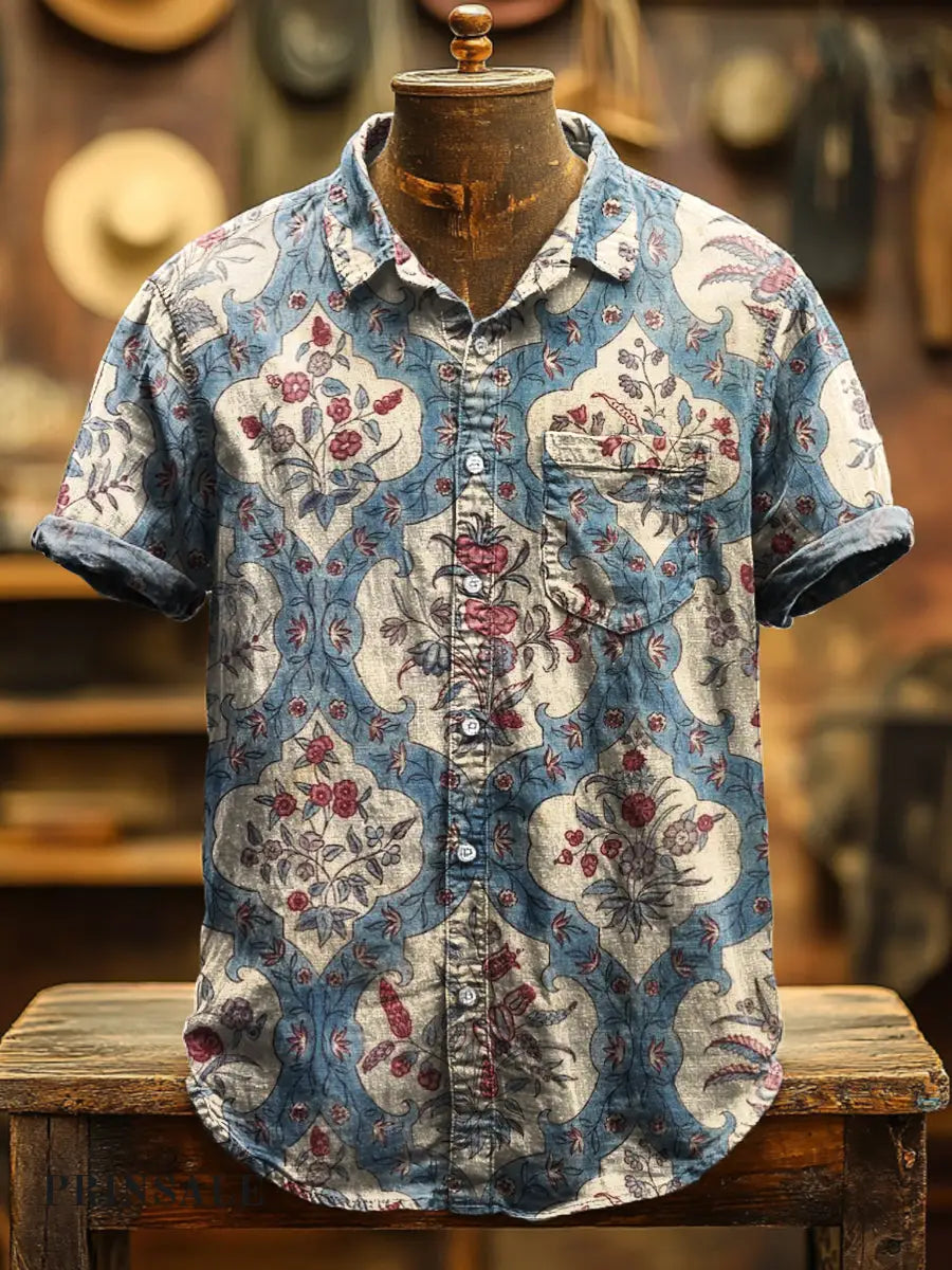 Vintage Geometric Floral Art Print Casual Short Sleeve Shirt
