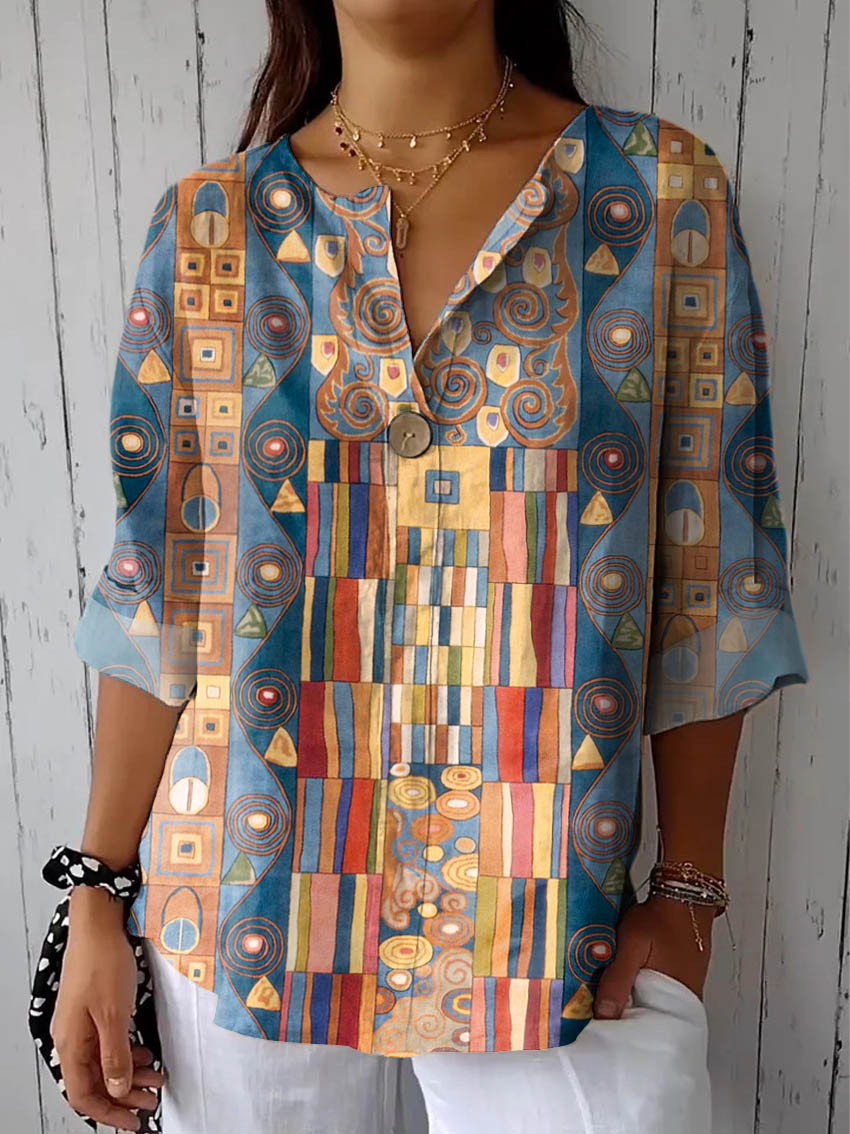 Women's Abstract Geometric Pattern Art Print Casual Cotton Linen Shirt