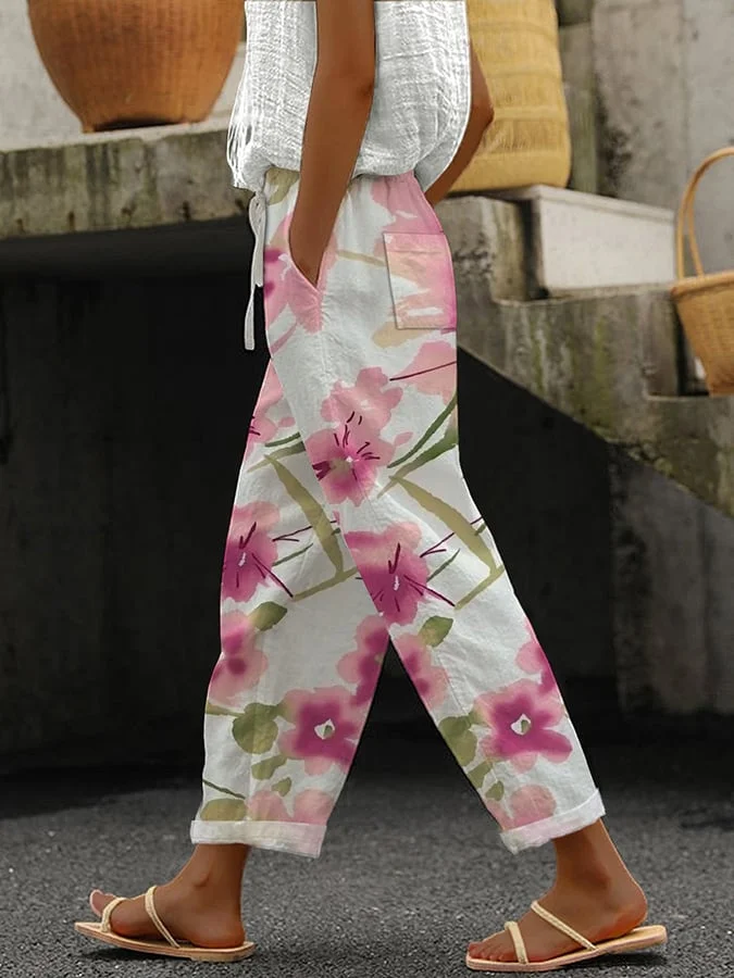 Women's Artistic Floral Lace-Up Loose Casual Pants (With Pockets)