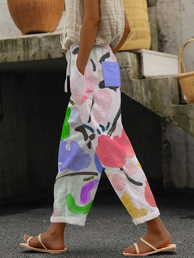 Women's Artistic Floral Lace-Up Loose Casual Pants (With Pockets)