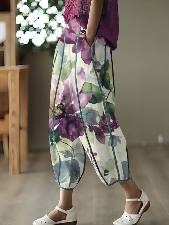 Women's Botanical Floral Design Contrasting Color Stitching Elastic Waist Loose Casual Pants