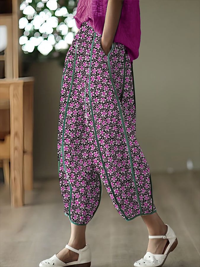 Women's Botanical Floral Design Contrasting Color Stitching Elastic Waist Loose Casual Pants