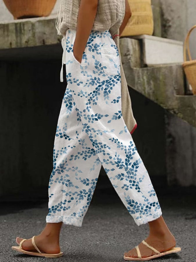 Women's Botanical Ink Painting Design Printed Lace-Up Elastic Waist Loose Casual Pants