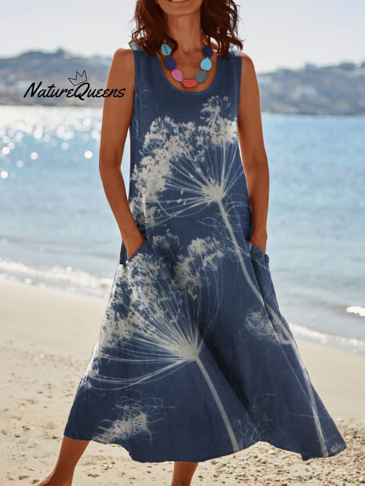 Womens Dandelion Print On Blue Background Pocket Pinafore Linen Dress
