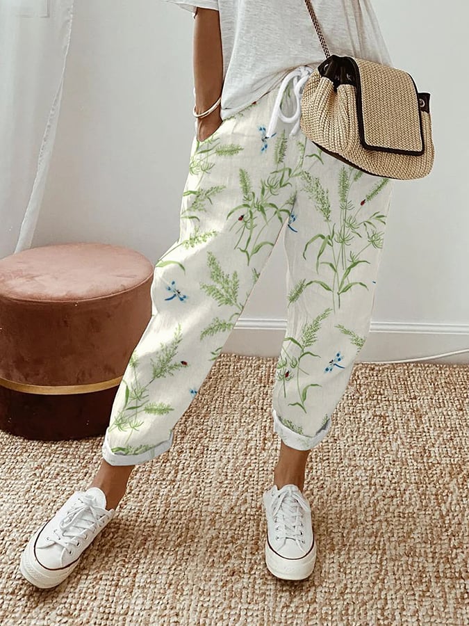 Women's Floral Design Lace-Up Elastic Waist Loose Casual Pants