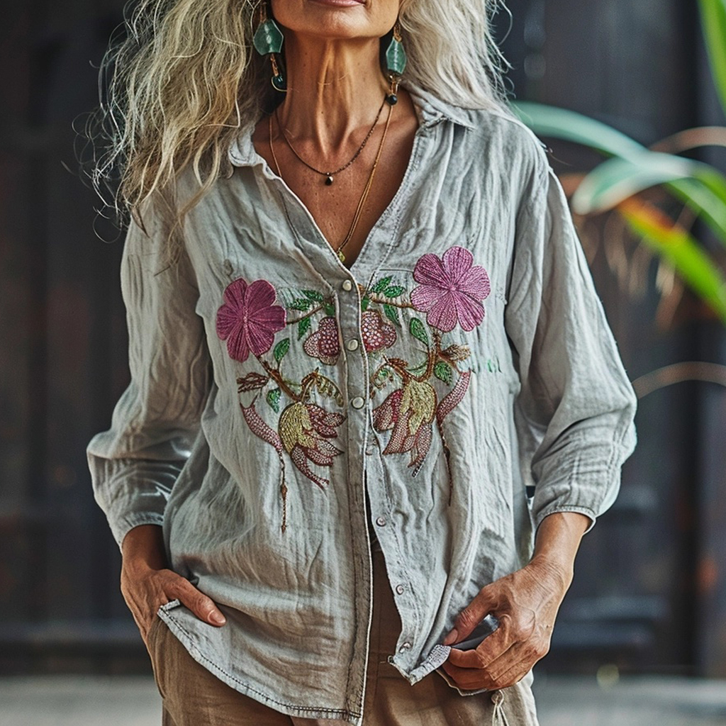 Women's Linen Casual Loose Ethnic Floral Printed Shirt