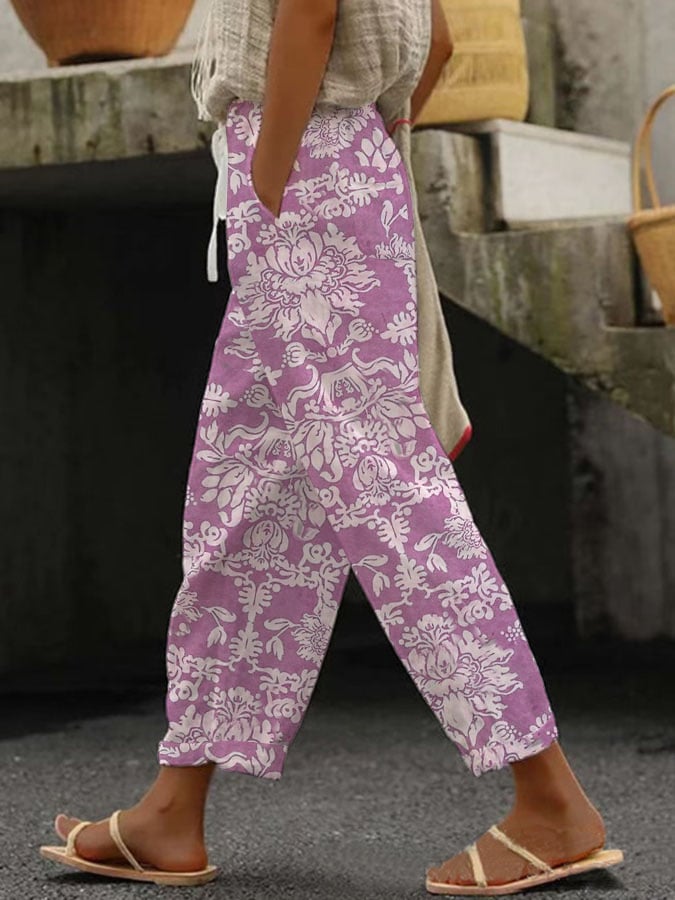 Women's Retro Floral Design Print Lace-Up With Elastic Waist Loose Casual Pants