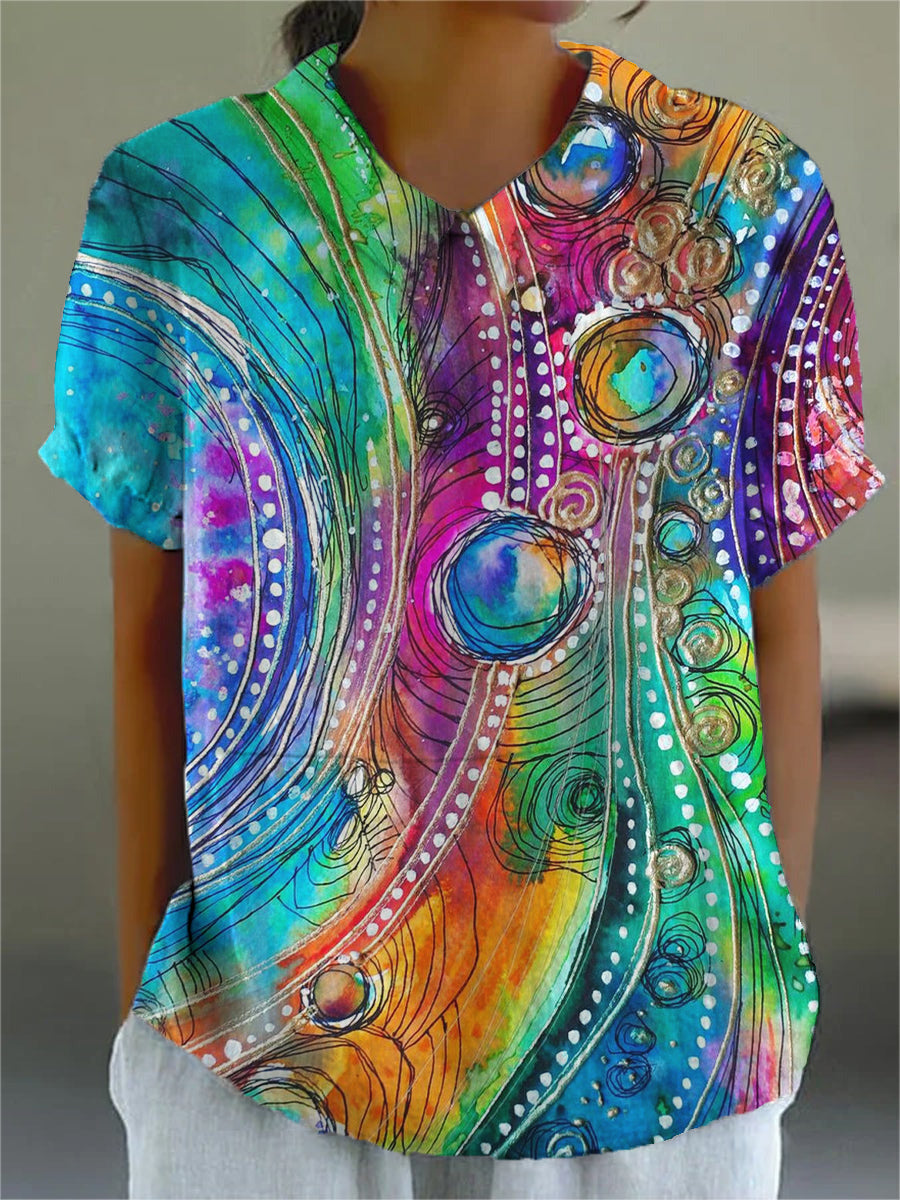 Women's Dreamy Collared Art Print Casual Cotton And Linen Shirt