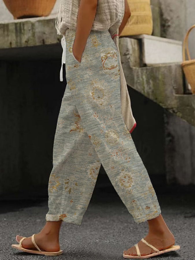 Women's Retro "Palace Style" Pattern Design Lace-Up Elastic Waist Loose Casual Pants