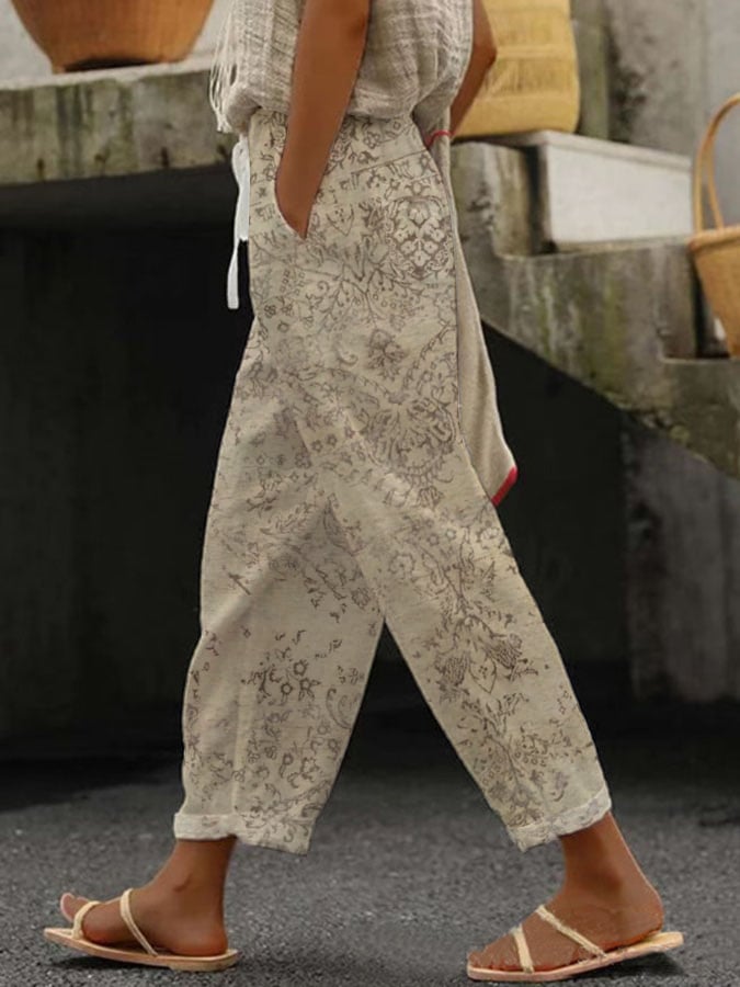 Women's Retro "Palace Style" Pattern Design Lace-Up Elastic Waist Loose Casual Pants