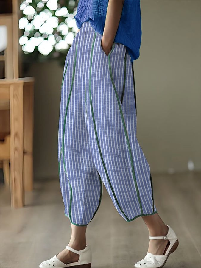 Women's Retro Striped Design Contrasting Color Stitching Elastic Waist Loose Casual Pants