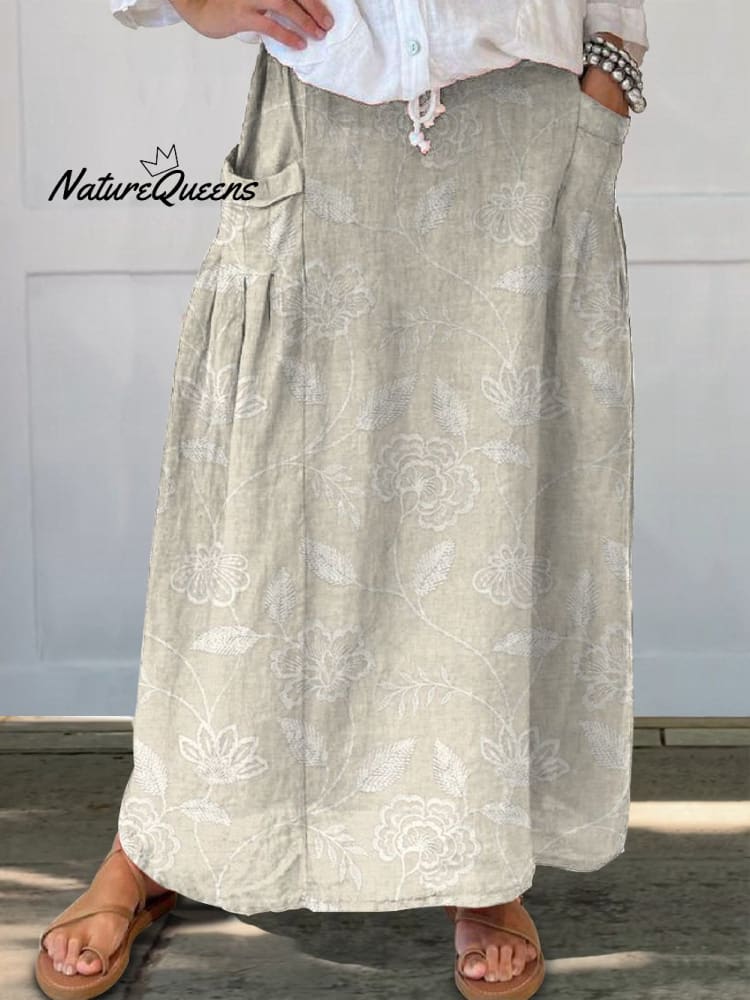 Women's Vintage Floral Art Linen Elastic waistband Pocket Skirt