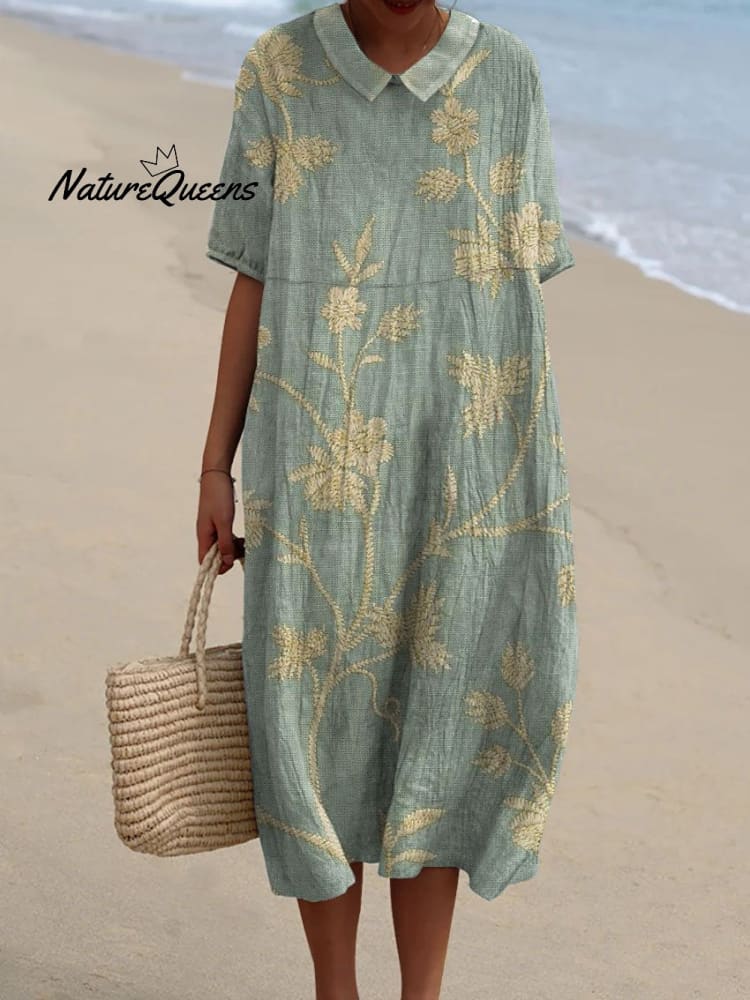 Women's Vintage Lovely Floral Art Print Casual Pocket Linen Dress(Convertible Dress With Front And Back Option)