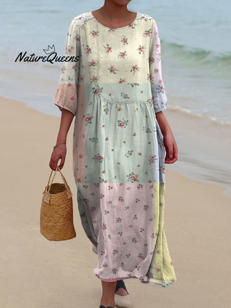 Women's Vintage Patchwork Floral Print Pocket Cotton Dress